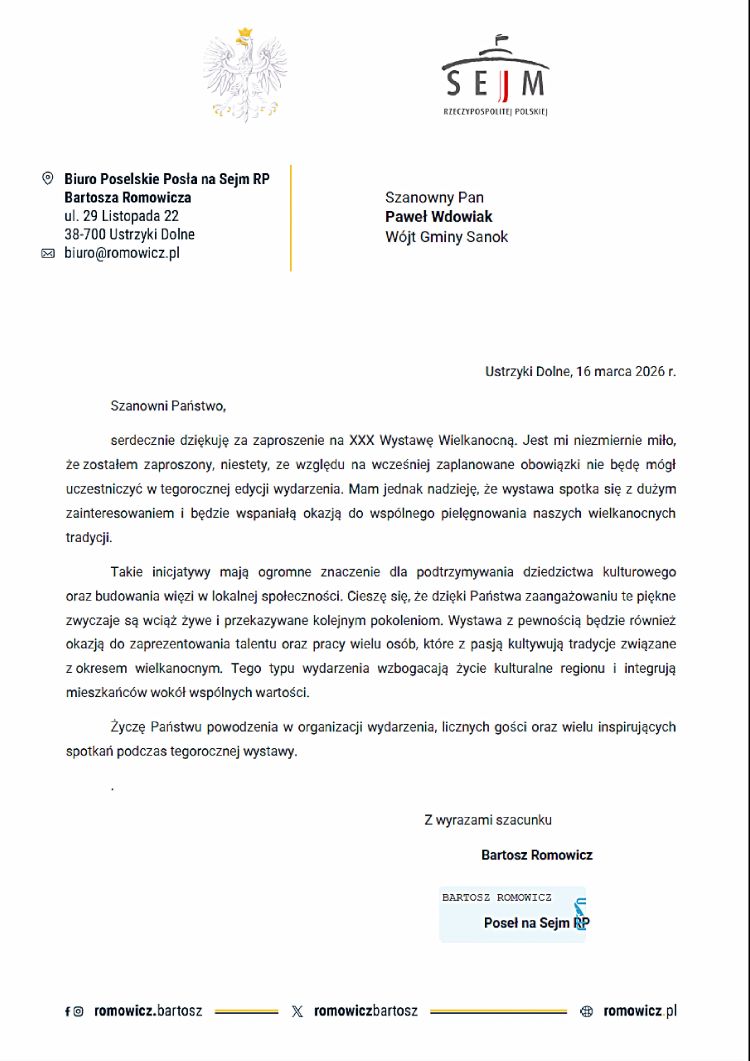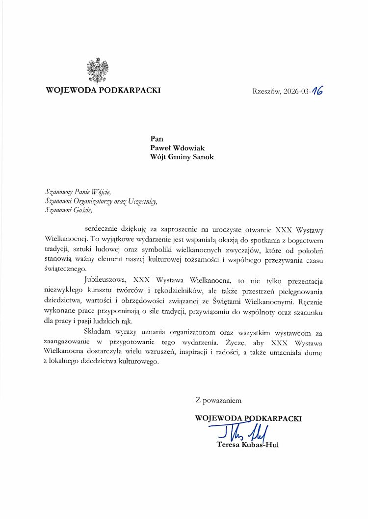 W dniu 17 marca 2026 r miało miejsce otwarcie jubileuszowej XXX Wystawy Wielkanocnej w Sali Bankietowej KARPACKA. Wydarzenie to, już po raz kolejny zgromadziło licznie przybyłych mieszkańców oraz zaproszonych gości tym samym tworząc niepowtarzalną radosną atmosferę.
